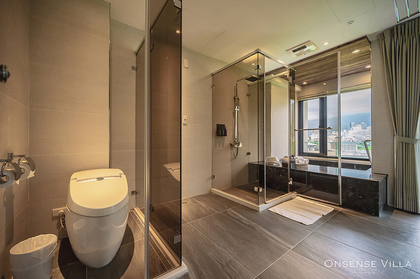 廁所、淋浴及湯泉的空間也都各自獨立,旅人們若要使用的話也不會打擾到彼此,當下有點覺得衛浴空間的坪數大到有點空曠了些,但再加上室外的露天陽台,可以說真的讓人有驚豔到!