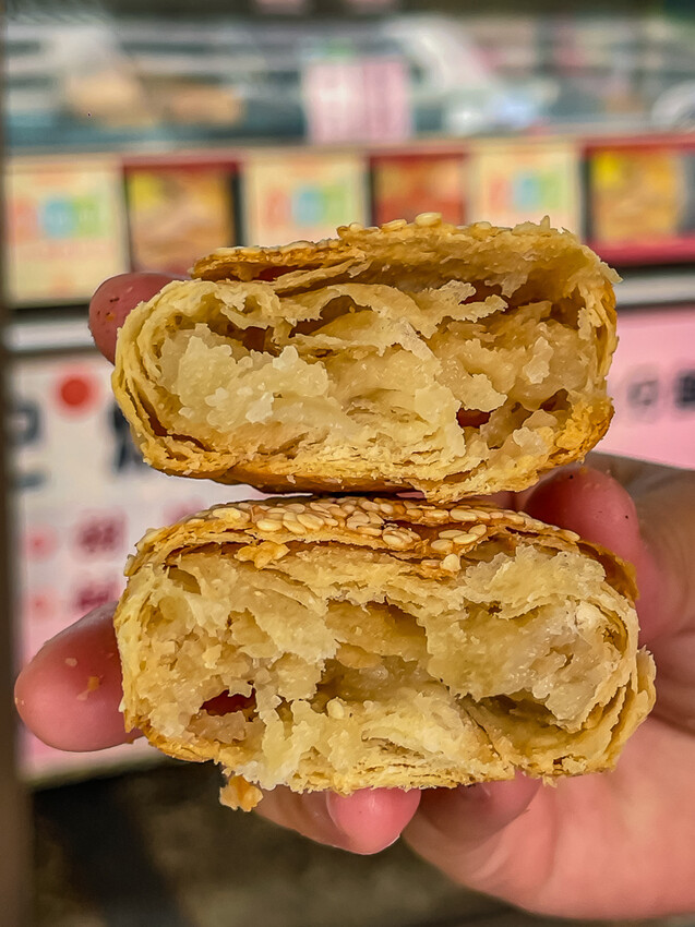 ▲▼甜燒餅是一種受歡迎的中式點心。它的內餡是麥芽糖,外皮酥脆,吃起來沒有油膩感,多了幾分酥脆乾香,且不黏口也不黏膩。甜燒餅上還會撒上芝麻,增添香氣。