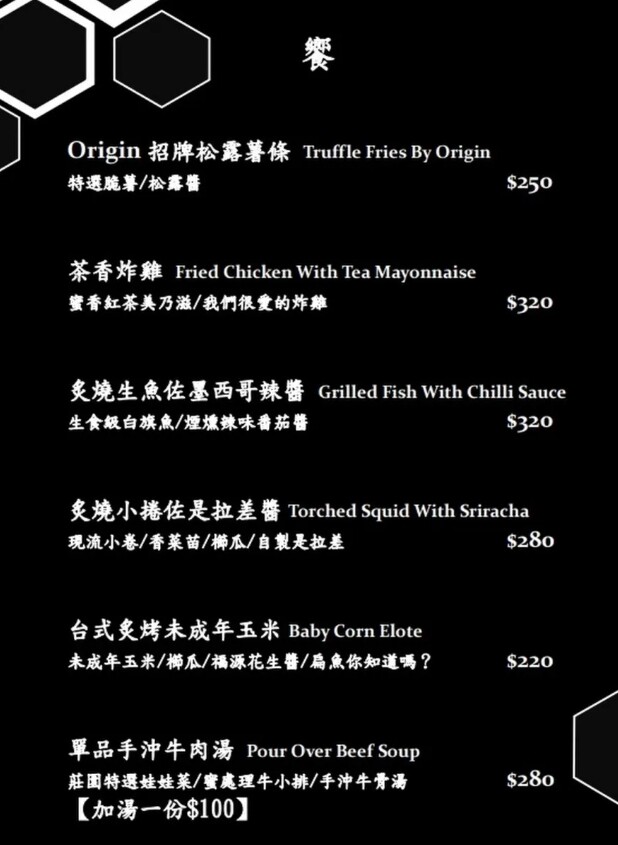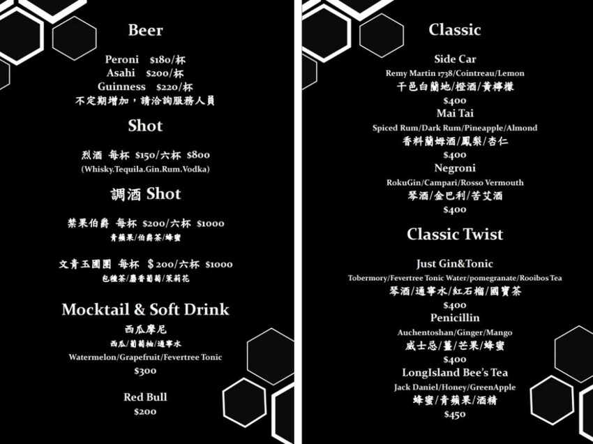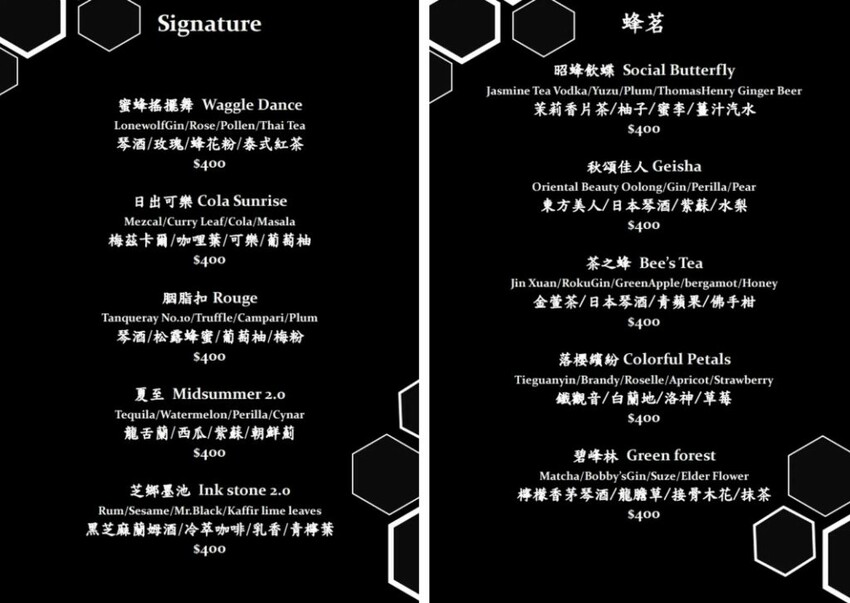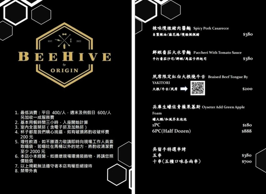 【Beehive by Origin】以創意的鹹食及酒類為主打,包含異國料理、台式牛肉湯和日式串燒等品項,還有多達數十款的特色調酒可挑選,平日低消每人400元,周末及例假日低消每人600元。