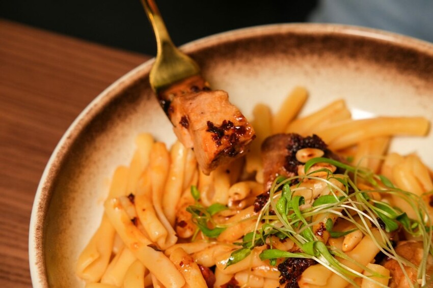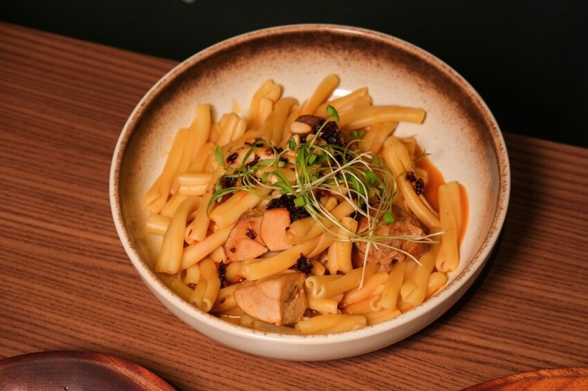 ▼創意中西合併的辣味慢燉豬肉醬麵,調味香辣又過癮,醬汁帶有花椒香氣很夠味,完整吸附在Q彈嚼勁的麻花捲麵條上,豬頰肉咬起來紮實略有咬勁,會讓人一口口停不下來!