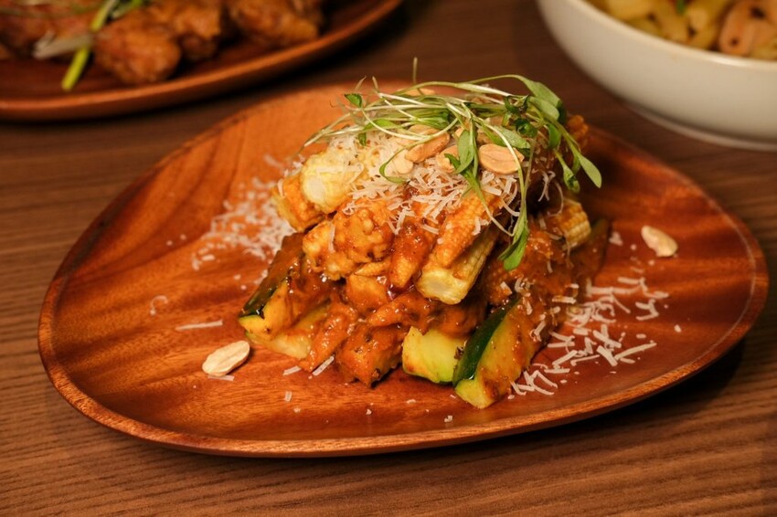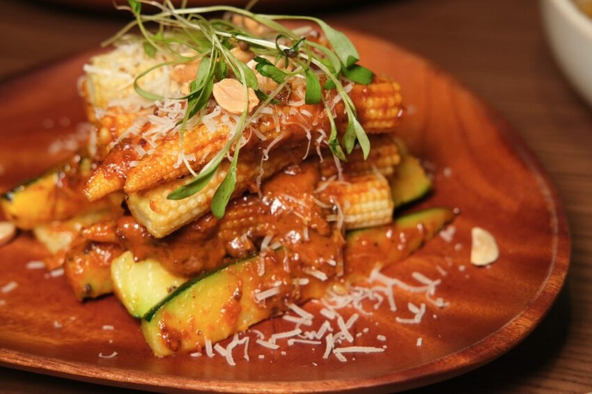 ▼同樣充滿新意的炙烤未成年玉米,結合傳統夜市烤玉米小吃的精隨,加入花生、扁魚乾和沙茶調味的特製燒烤醬,爽脆的玉米筍沾滿了濃郁醬汁,每一口吃起來都好濃好香啊。