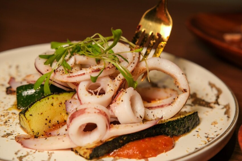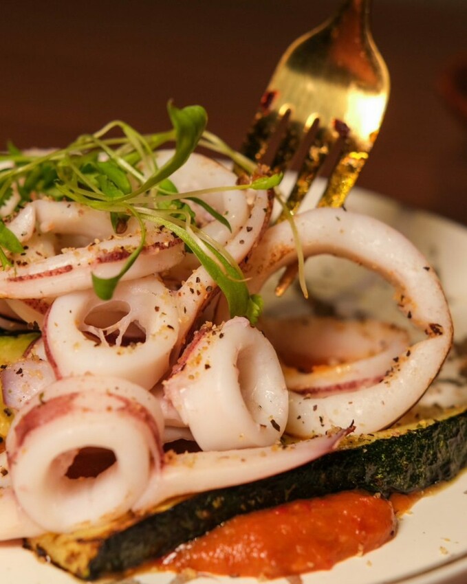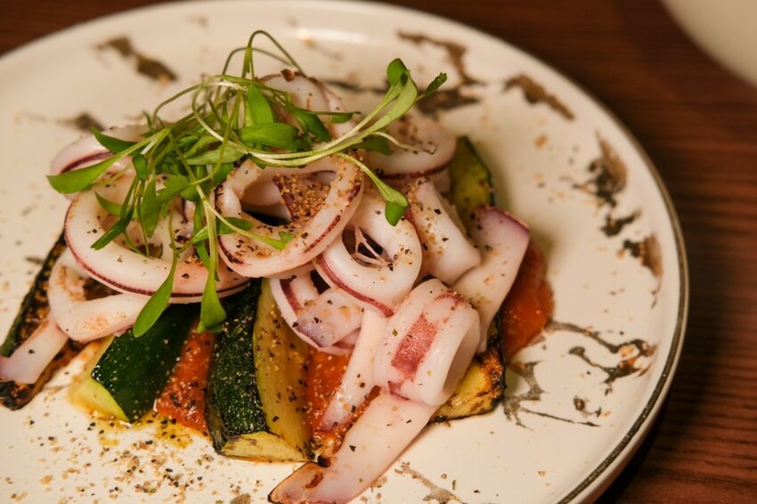 ▼富有美式風味的炙燒小捲佐是拉差醬,將新鮮小卷搭配新鮮櫛瓜及香菜苗,淋上帶點微辣香氣的是拉差醬,是一道相當清爽開胃的菜品。