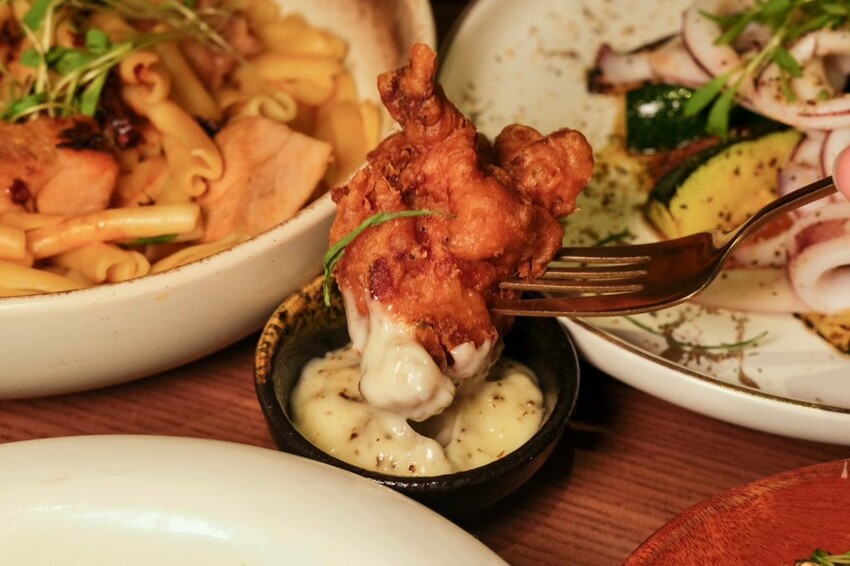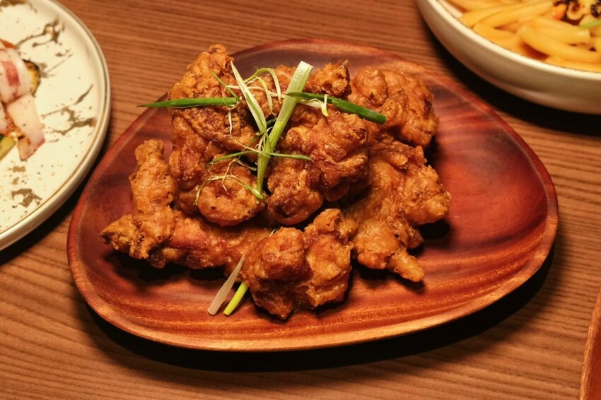 ▼榮登我最愛的茶香美乃滋炸雞,外皮炸到金黃酥脆的模樣,咬下還會卡滋卡滋,裏頭的雞肉鮮嫩且多汁,沾上融合台灣紅玉茶香的美乃滋,層次風味感十足,也讓整體不會過於膩口