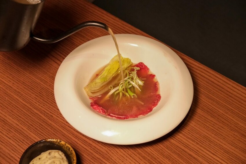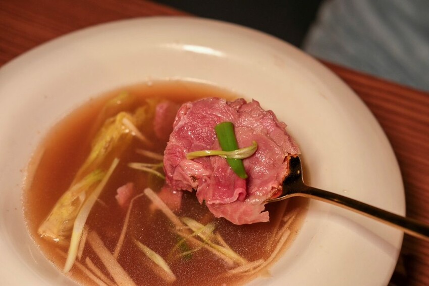▼在桌邊上演表演秀的單品手沖牛肉湯,將牛骨熬製的高湯淋在牛小排上,牛肉瞬間呈現夢幻的粉嫩色澤,咬起來更是口感鮮嫩多汁,充滿甘甜牛肉香的湯頭,喝了讓人感到暖心又暖胃。