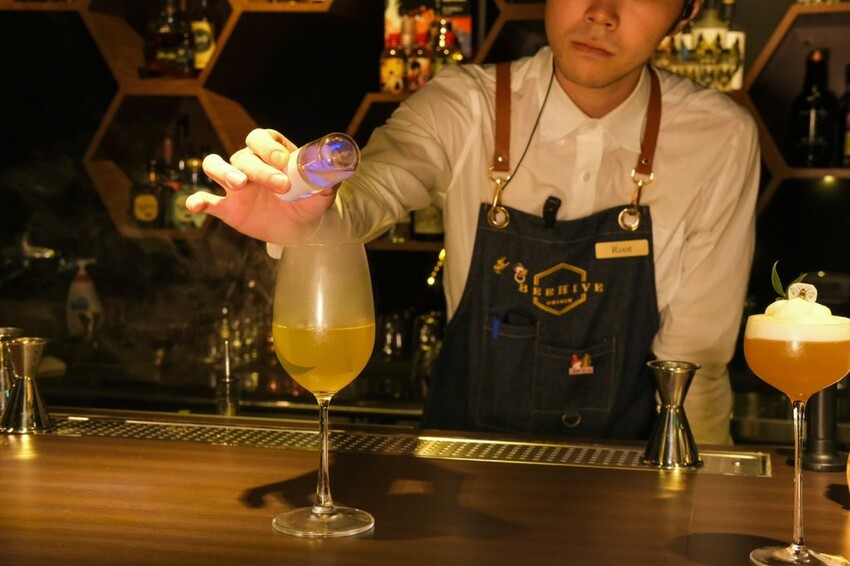 ▼【Beehive by Origin】的吧檯能看到豐富多樣的酒品,擺放在蜂巢造型的櫃子當中,的由專業的調酒師現場調製,過程就像欣賞了一場精采的表演。
