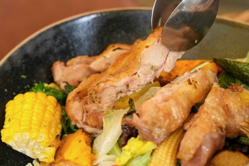 ▼賣相繽紛的嫩雞腿凱薩沙拉,以新鮮健康的蘿蔓與紅橡為基底,還有烤南瓜、番茄、蘑菇、玉米筍等蔬菜,搭配烤到金黃酥脆的嫩雞腿肉,吃起來充滿營養和蛋白質。