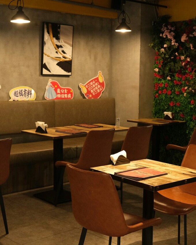 ▼【不二煮藝】用餐環境走的是工業風路線,灰色系的牆面在植栽點綴下,打造出有如森林般的氛圍。