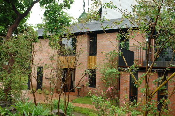 隱約可以看見一棟紅磚屋
