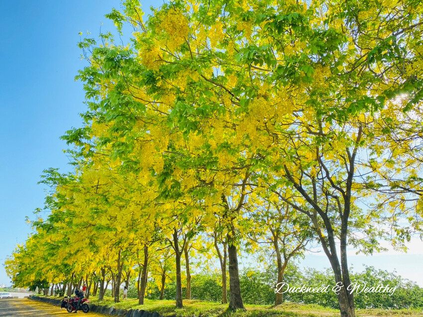 曾文堤防處旁的大片阿勃勒在陽光照耀下閃耀的迷人,