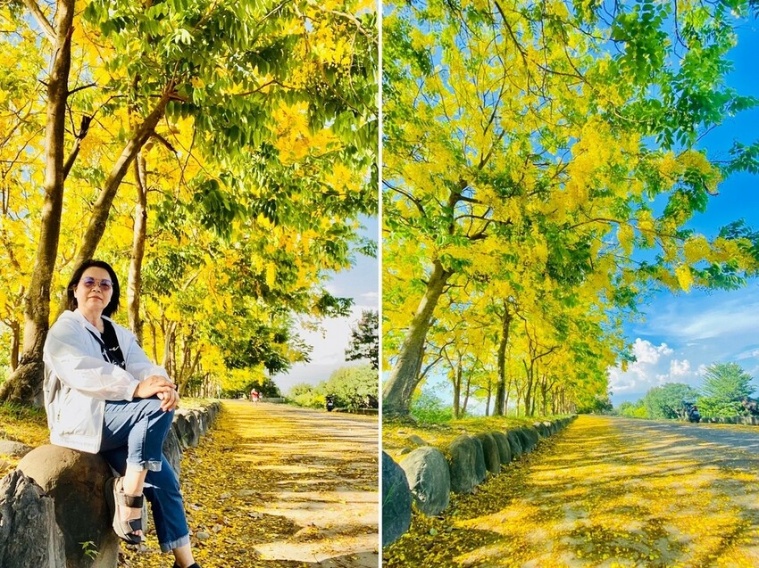 「蘇厝河堤公園」走在佈滿阿勃勒金黃色落下花朵之步道中,