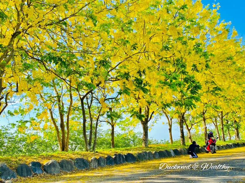 滿樹金黃與飄落的黃金雨,加上滿地金黃花毯,如此浪漫美景令人非常陶醉!!