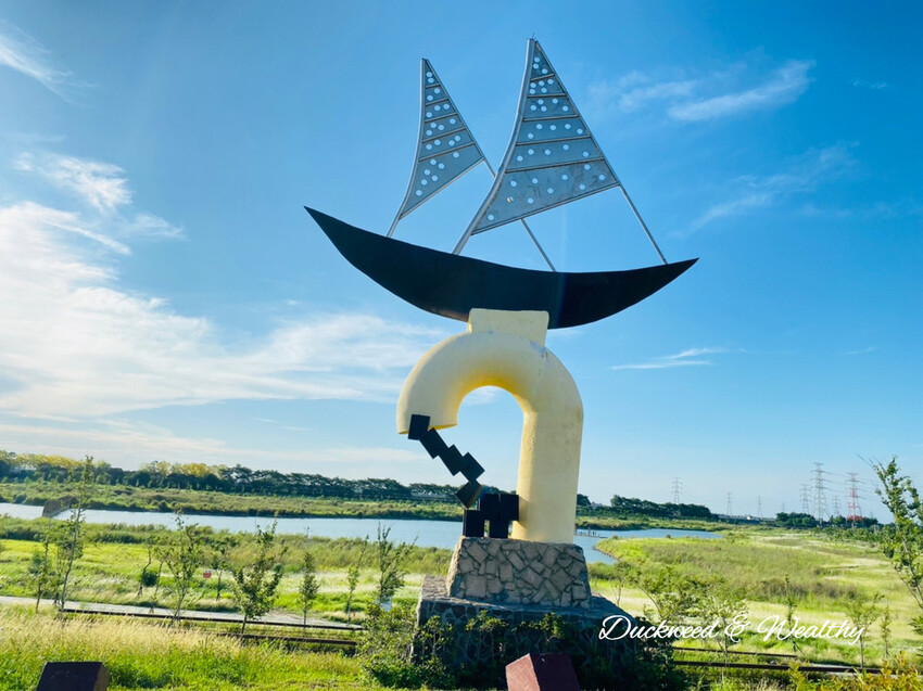 「蘇厝河堤公園」「滯洪池」綠堤曼波散步道,入口即有王船拼貼藝術意象