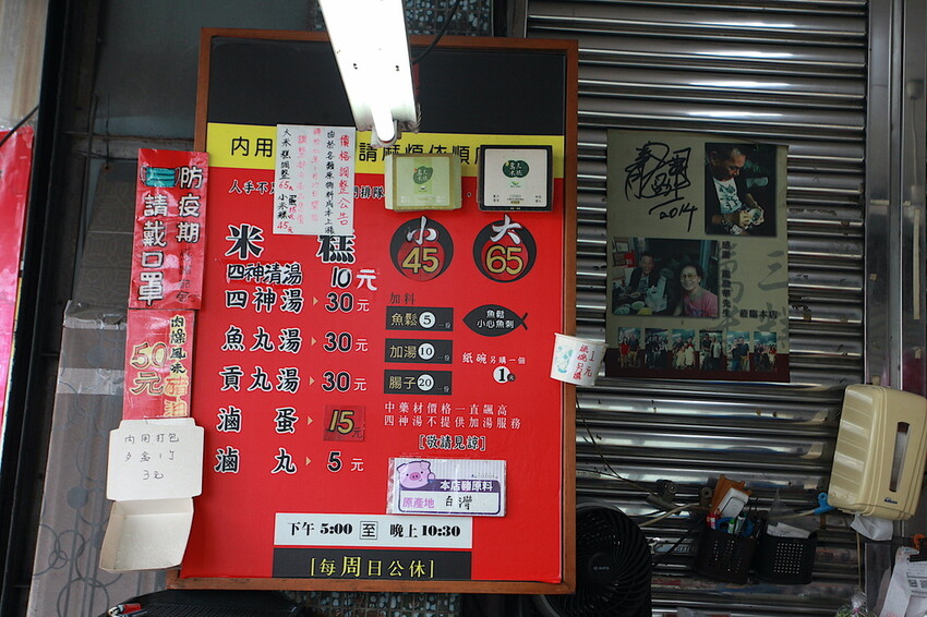 牆面有掛著菜單供客人點餐參考,這裡菜單主要有米糕、四神湯、魚丸湯、貢丸湯、滷丸及魯蛋等,米糕主要分大65元跟小45元。