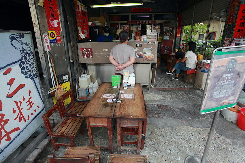 店面就設置在騎樓前方有擺放桌椅供內用,這桌椅是小學課桌椅看起來特別親切。