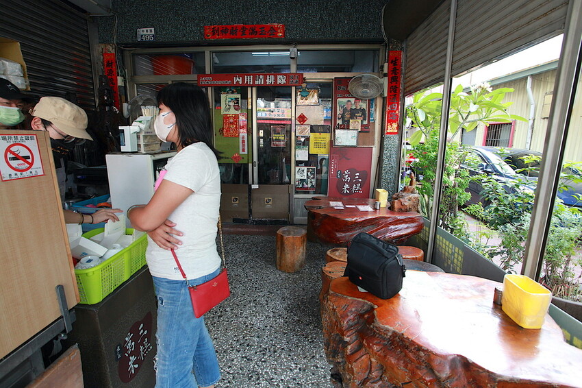 騎樓有一半空間是料理台,另外一半空間是放置厚重原木桌椅,這些桌椅是供給顧客坐下來用餐。