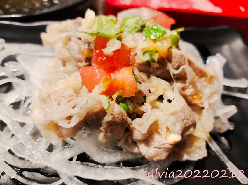 ▼泰式南洋風煮好的牛五花和泰式醬(裡面大概有蔥、蒜、辣椒、番茄丁、味霖、香菜)拌勻,然後鋪在洋蔥絲上,如果不愛香菜記得要說。