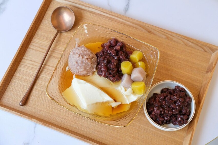 ▼冷熱都有供應的古早純豆花,提供多達數十款的配料選擇,可以自選喜歡的三款配料,豆花吃起來豆香味十足,搭配糖水甜度恰恰好,配料推薦帶有顆粒感的芋頭泥,口感豐富又不失香氣。