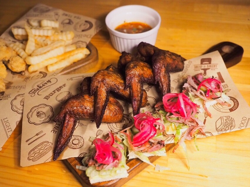含手撕豬迷你三明治、BBQ雞翅四隻、雞米花、薯條,