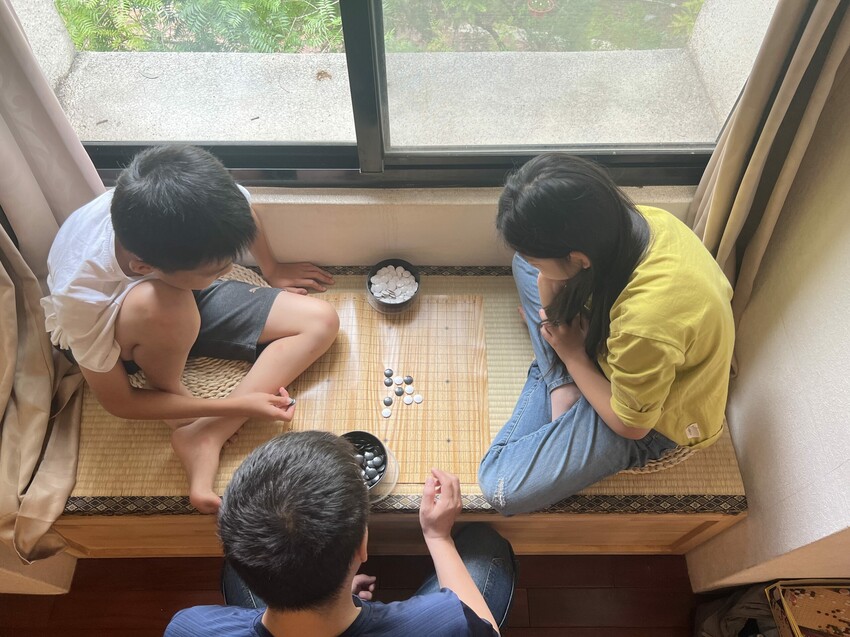 退房前兄妹倆也和爸爸一起下了幾盤五子棋