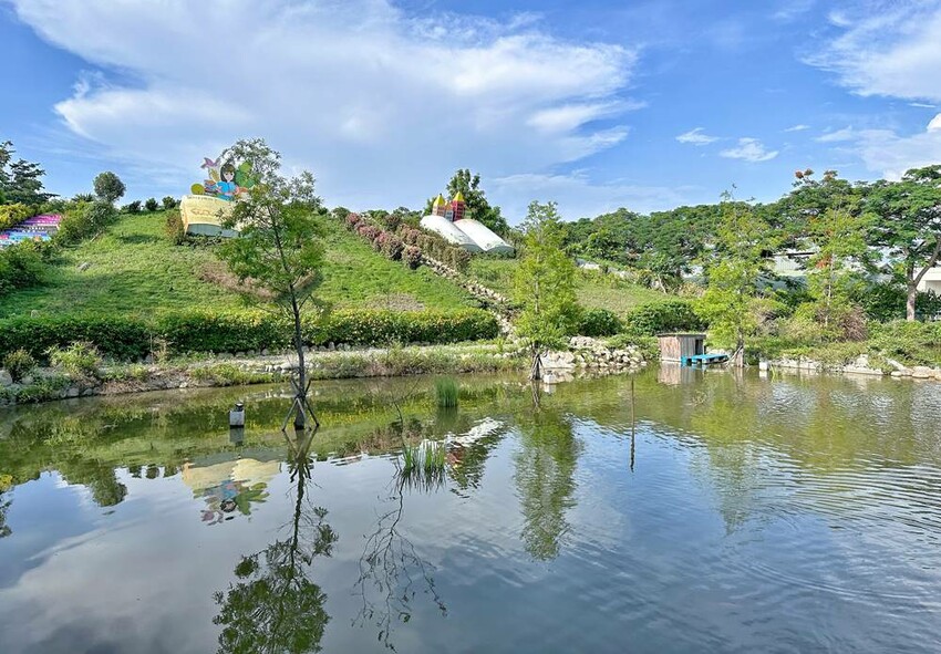 而邱比特花園裡有著偌大的草皮、戲沙池、生態池、小山坡等裝置藝術,一旁也還有可愛動物區,像麝香豬、烏龜、兔子等等,但館方是沒有開放給遊客餵養喔!