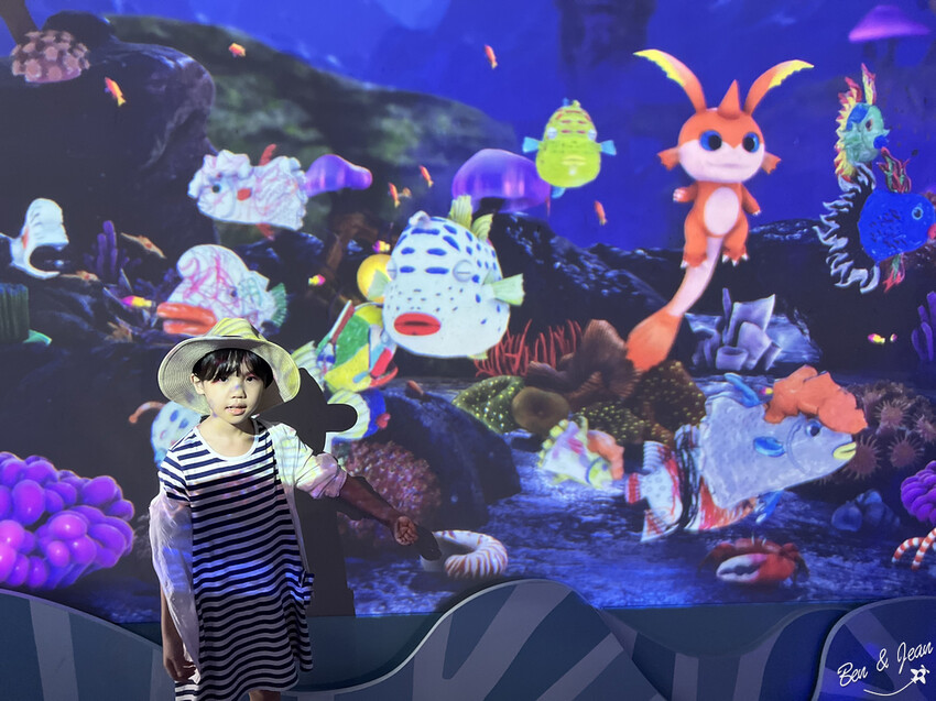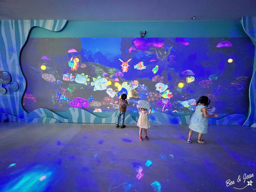 一整面的互動式螢幕,遊客透過觸碰的方式,找到隱藏在海底的生物,家中用整這樣的牆面也不錯吧