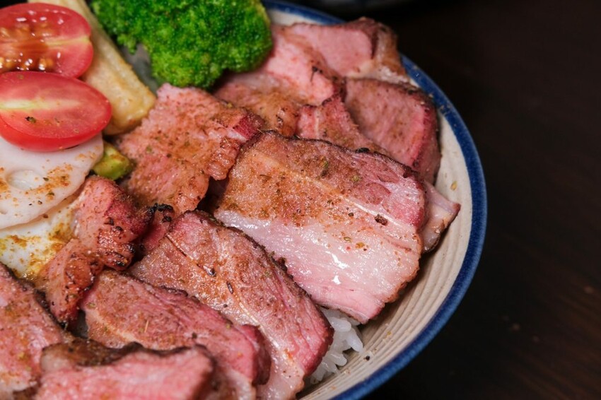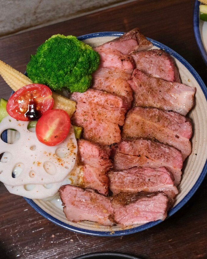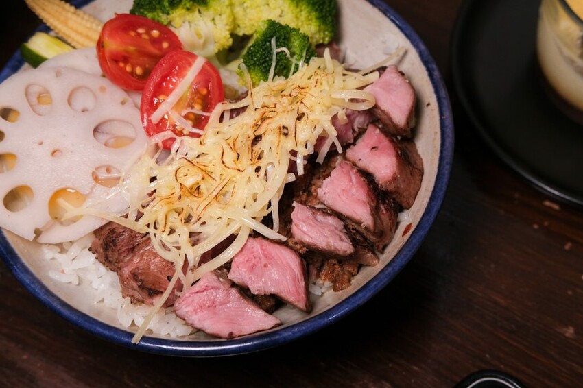 ▼人氣招牌硬派主廚的軟嫩牛排飯,選用Choice等級牛肉,以舒肥料理,呈現粉嫩的誘人色澤,咬起來軟嫩又多汁, 還有炙燒起司營造出煙燻風味,再搭配蓮藕、南瓜、花椰菜、蕃茄、小黃瓜等食材,豐富度十足,每一口都讓人好滿足~