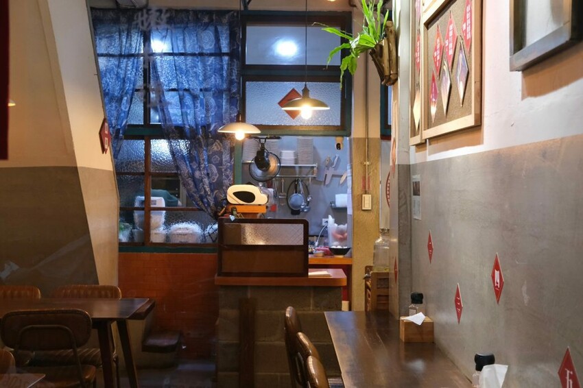 ▼【硬派主廚的軟嫩料理】用餐空間共有兩層樓,保留了老宅原始的建築及復古花窗,搭配懷舊裝飾及趣味的文字,營造出古色古香的迷人氛圍。