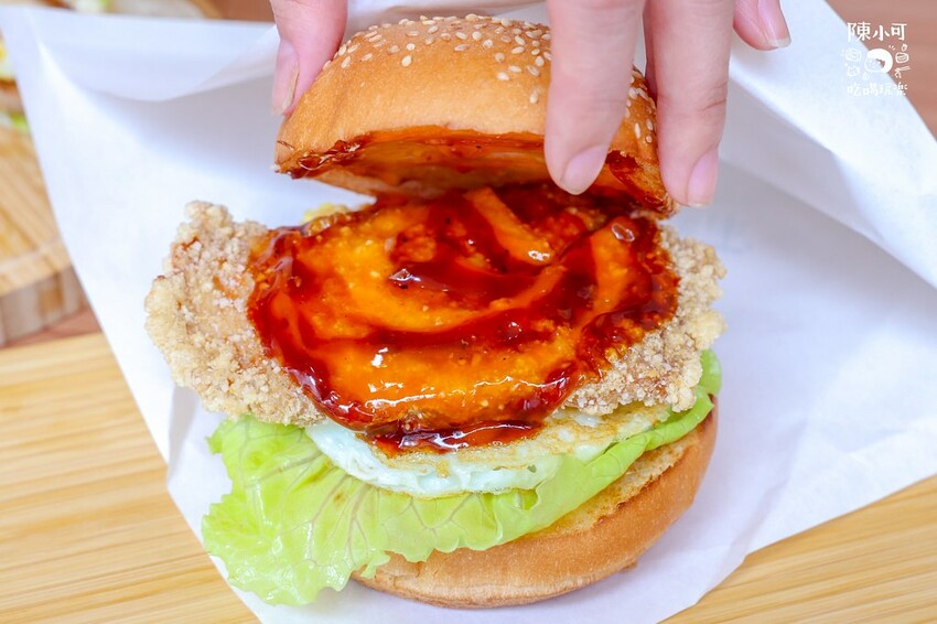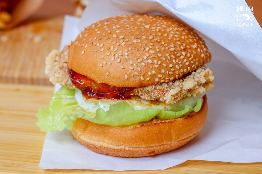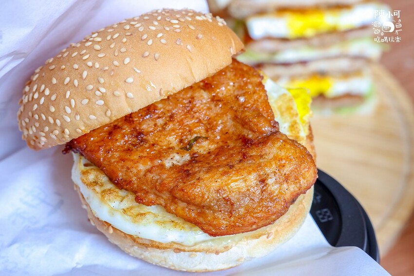 拆開包裝紙袋,看到圓滾滾漢堡夾著炸里肌豬,腦海想到剛才看到的製作畫面,店家都是收到點餐才將豬排裹粉油炸,食材新鮮而且沒有油炸多次的問題。