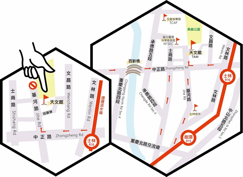 - 接駁公車:兒樂1號、紅12、紅30(經捷運士林站),兒樂2號、41、市民小巴8,紅30(經捷運劍潭站),均到達天文館站。