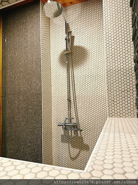 獨立的淋浴空間,搭配著小小的磁磚,頗有日式澡堂氛圍~