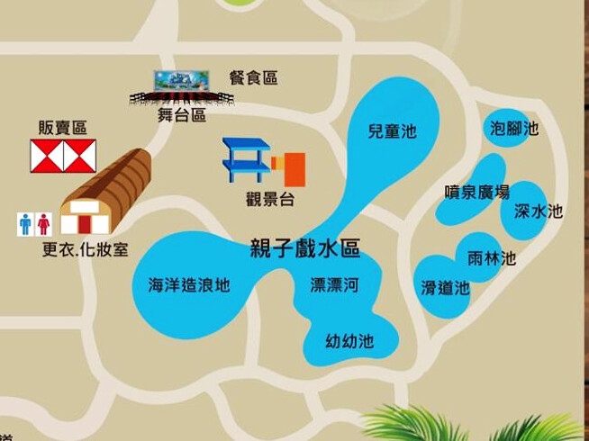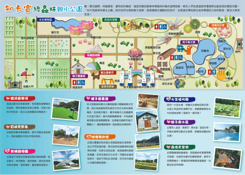 ▲知卡宣率森林親水公園地圖,門口左邊是有兩處遊戲場,右側是親水公園戲水區