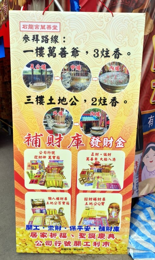 ▼這裡也有附上參拜路線,一樓是萬善爺,有三個爐所以需點3炷香;三樓的土地公則是2炷香,天公爐、土地公爐各一炷即可!另外這裡也有販售各種發財金,不管是公司行號、求財、補財庫、保平安等通通都可以來這裡祈願!