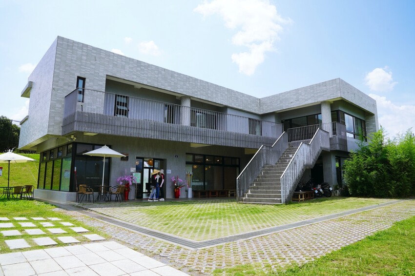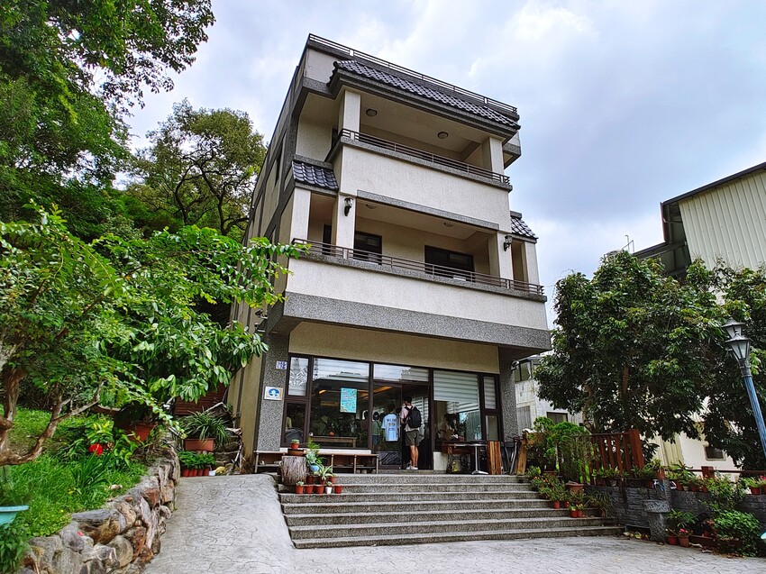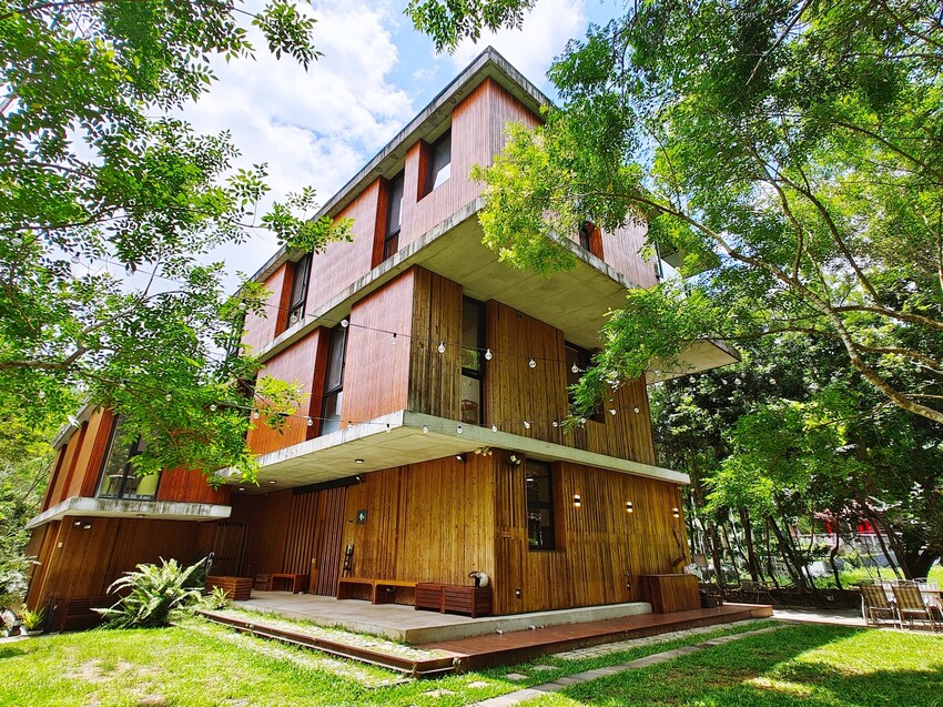 ▼水泥角生態民宿由水牛建築師事務所設計,曾入圍 2020 第七屆台灣住宅建築獎。根據建築師的說明,民宿基地從東南側社區道路往西北側微微抬升,但相鄰的親水公園地勢又高了一層樓,建築量體的規劃和配置,須考慮方位和二側地勢銜接;其重點在於面對道路側的量體要低,不要高過樹稍,而面對親水公園方向的樓層卻又要夠高,以取得良好視野。因此將建築切分成一高一低,再略為錯置,在視覺上形成二棟相連的小房子,而非巨大的單一量體。