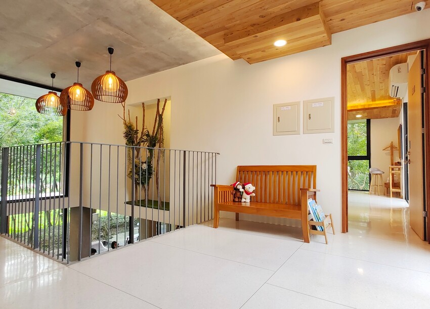 ▼水泥角生態民宿是由樓梯串起的連續性空間,藉由穿越大廳上方的挑空,看到大廳的空間與交流情況,通往各樓層起居空間的動線,也能感受人的活動與戶外環境。