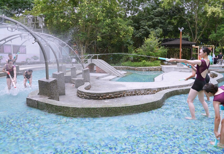 ▼桃米親水公園水池分三個區域,池水不深,大約介於成人的小腿肚到膝蓋,家長們可以讓小朋友放心玩,但仍須注意孩子動態。場內也有提供大小透明球提供兒童完玩耍,水槍、替換衣物需自備。