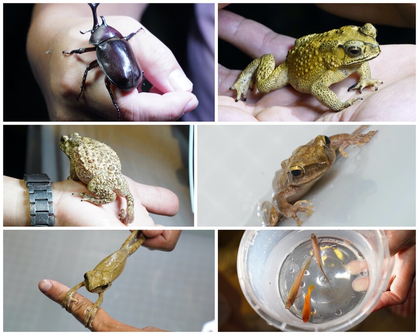 ▼入住水泥角生態民宿晚上 8 點至 9 點,約1小時的夜間導覽,由民宿老闆帶領住客,在民宿內的生態池走一圈,認識蛙類、魚蝦生態,聽著腹斑蛙「給給給」鳴聲,一虧窺見各種蛙類的外型與習性,尋訪園區內光蠟樹,探索獨角仙吃樹液的痕跡。六月至七月初是常見獨角仙的季節。