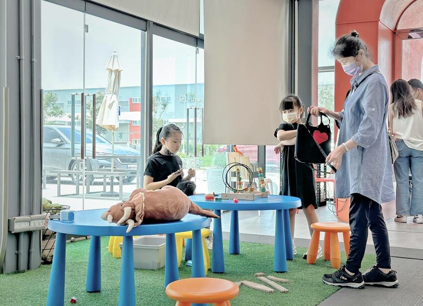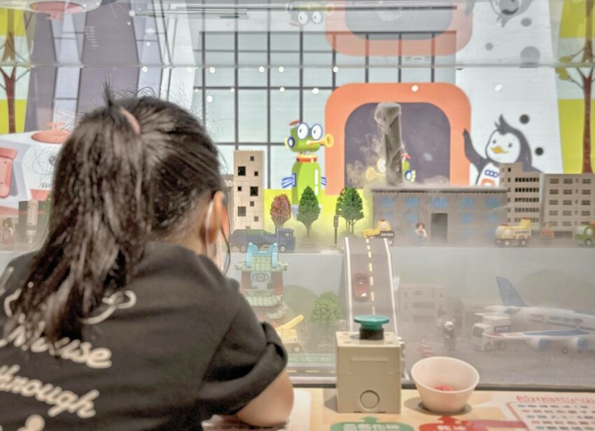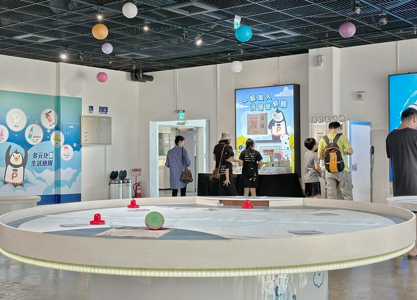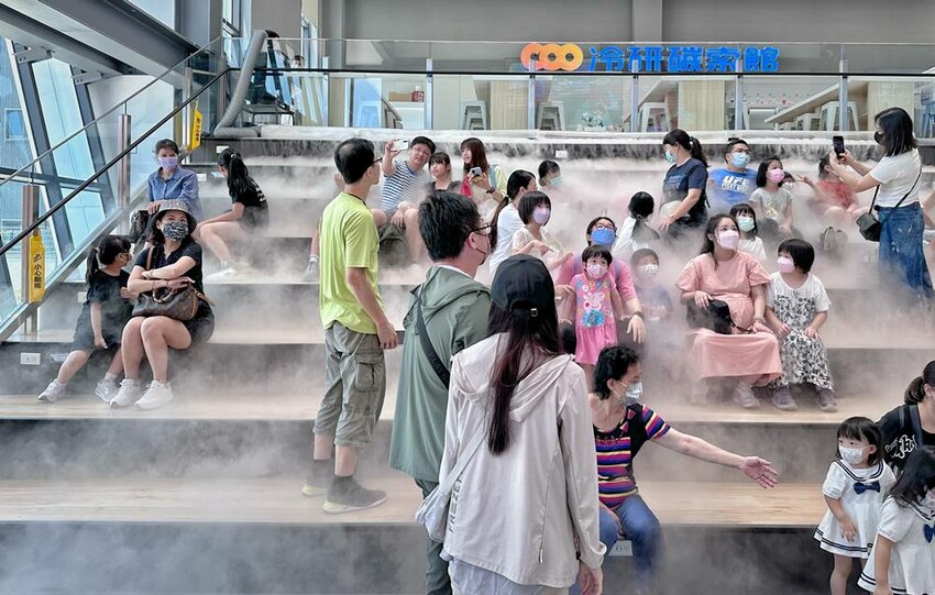 走進冷研碳索館館內,左側超大的階梯式坐椅,這可是定點時段的必拍照打卡點–乾冰瀑布,但在一般時段就是大家的休憩區,階梯正對面牆上會有投影布幕,不時都會放映著氣體知識的影片,休憩的同時也能吸收知識真的挺不錯;同時也在櫃台旁設置兒童遊戲區,讓大人可以坐在階梯上休憩順便顧到小寶貝們。