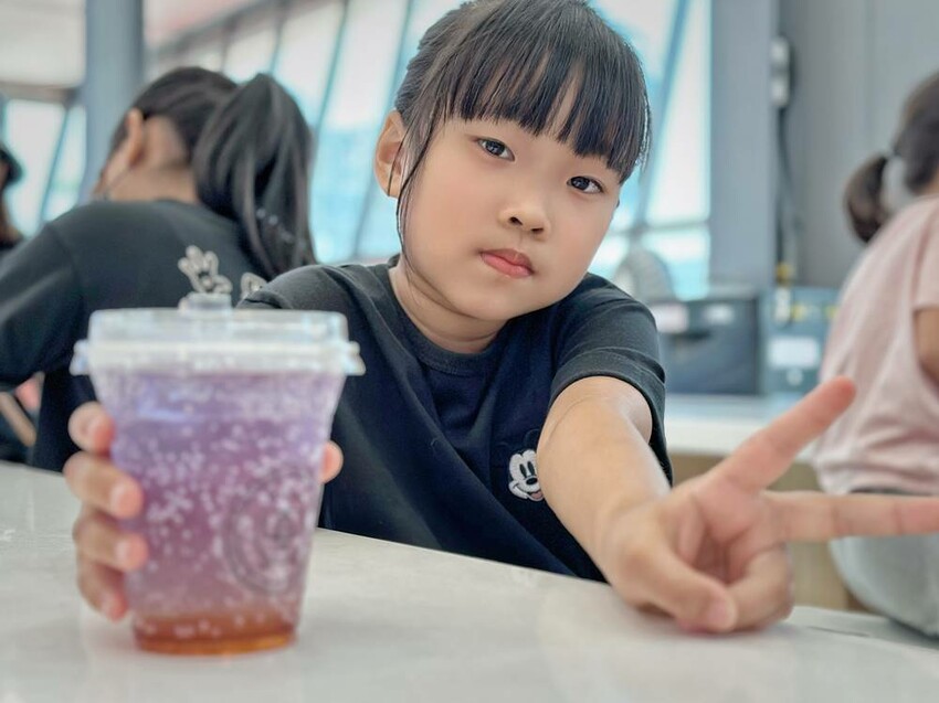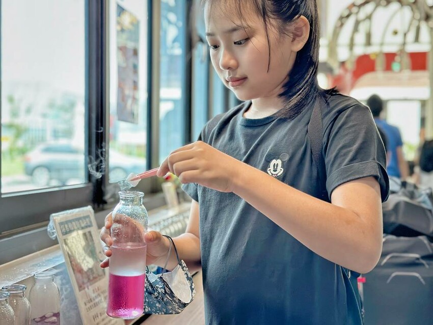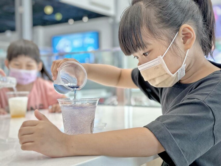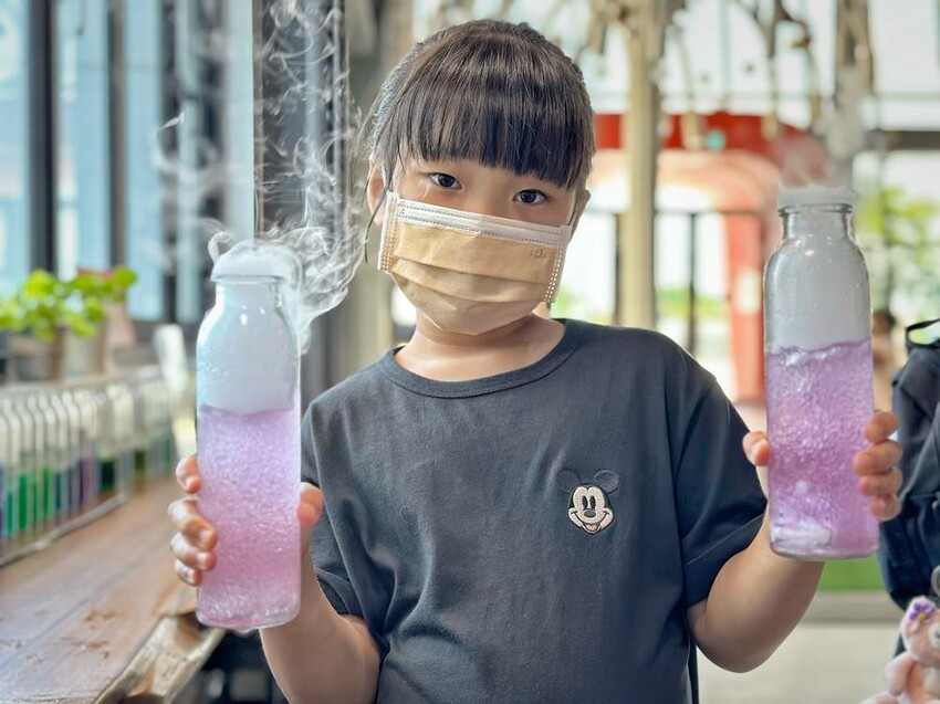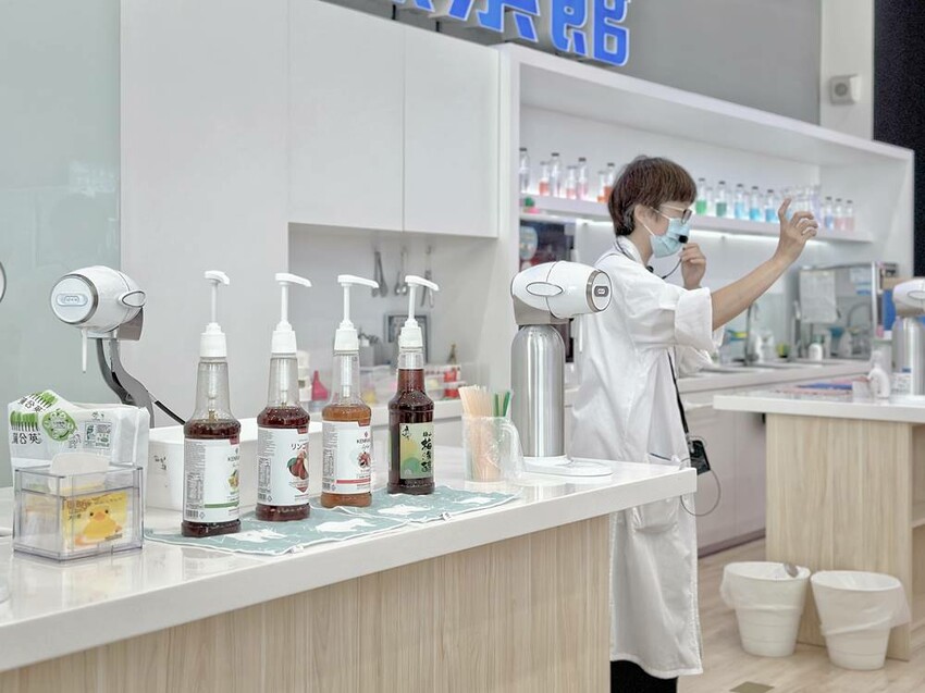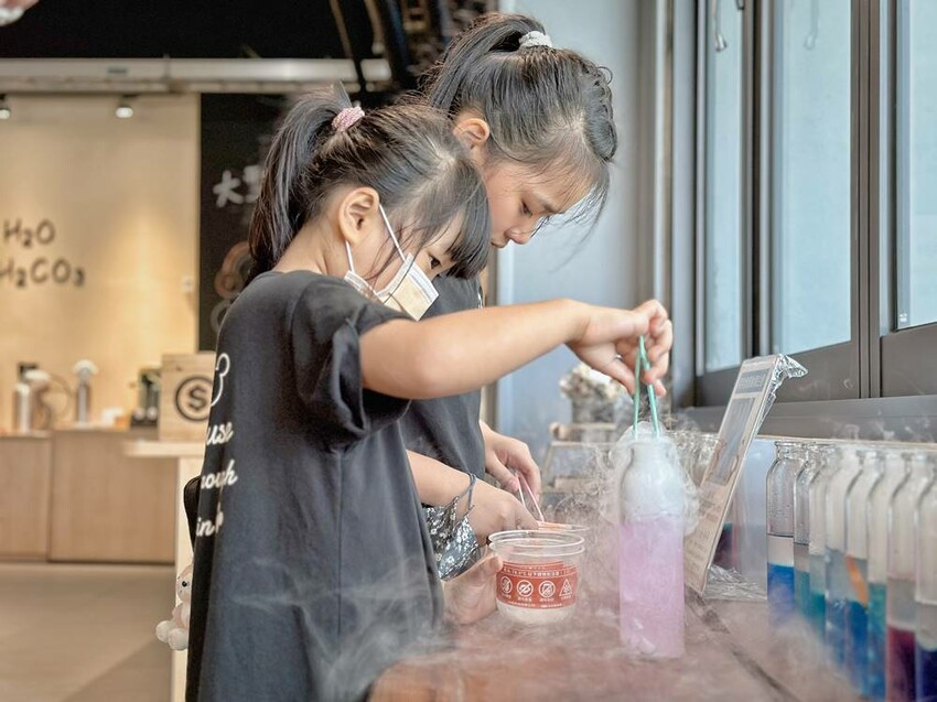 走上二樓,可直接看到DIY的區域,這是需要另外付費才能參加體驗,每個時段的課程都不一樣,詳情可以詢問櫃檯人員,而我們這次體驗”漸層氣泡飲”,簡單說就是利用氣泡機、水、冰塊、蝶豆花、醋飲來製作漸層飲品,整個體驗時間不到30分鐘就結束。