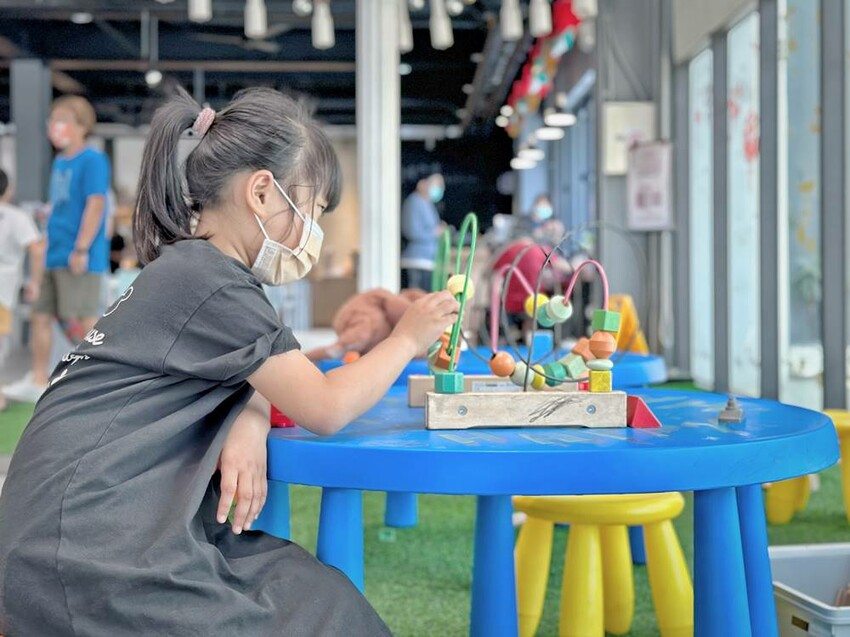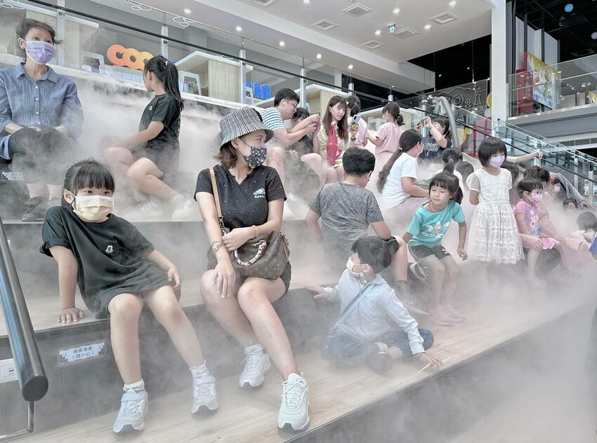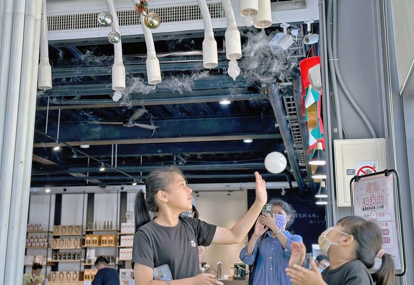 在兒童遊戲區的旁邊也有個定點時段才能體驗的拍照打卡點–泡泡樹,泡泡樹的體驗時間長達一小時,泡泡樹會不斷吹出乾冰泡泡,不少大朋友小朋友都會搶著去把泡泡戳破,戳破後就會有乾冰散出,這真的讓許多大小朋友都在這玩得超開心。