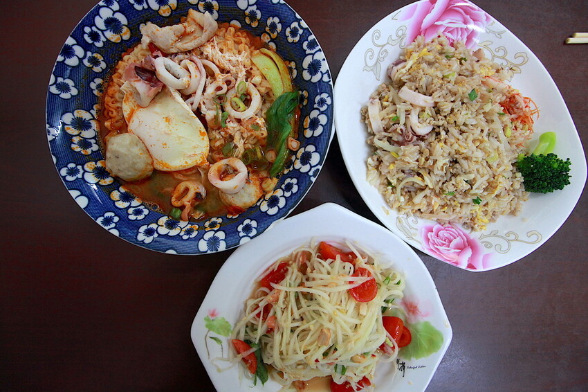 今天點海鮮酸辣麵90元、海鮮蛋炒飯105元及泰式涼拌青木瓜80元等。