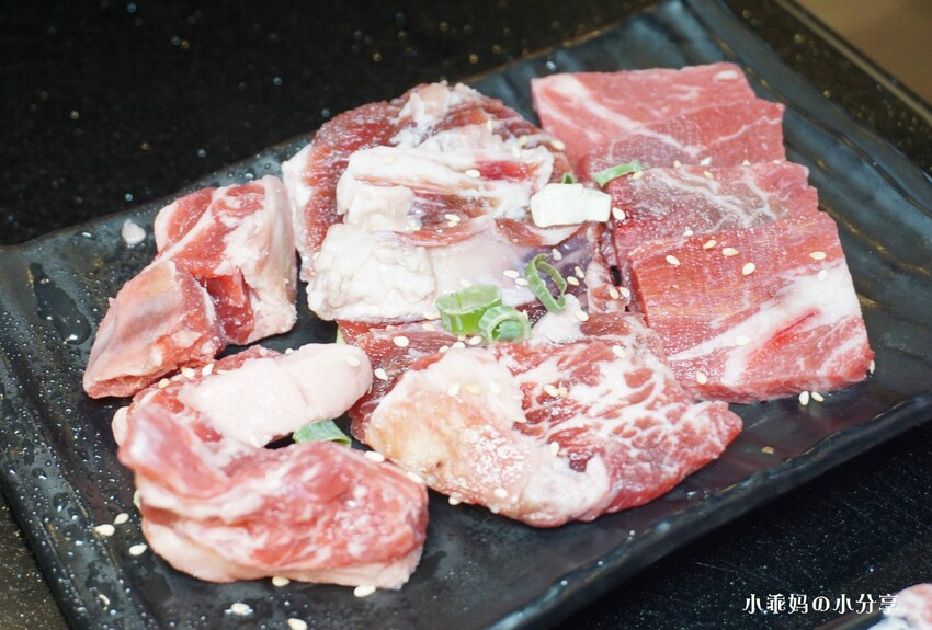 瓦崎的肉品是現點現切的喔,但速度還蠻快的,我點了牛五花、醬燒牛、安格斯翼板牛、牛舌、戰斧豬排、牛肋條、極上牛橫隔膜、西班牙松阪豬、骰子牛、醬淋豬五花…….