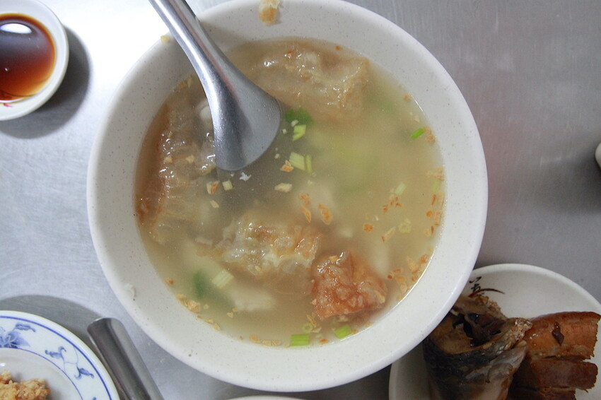 這碗鹹粥有魚肉、鮮蚵、油條、芹菜末及油蔥酥等配料。
