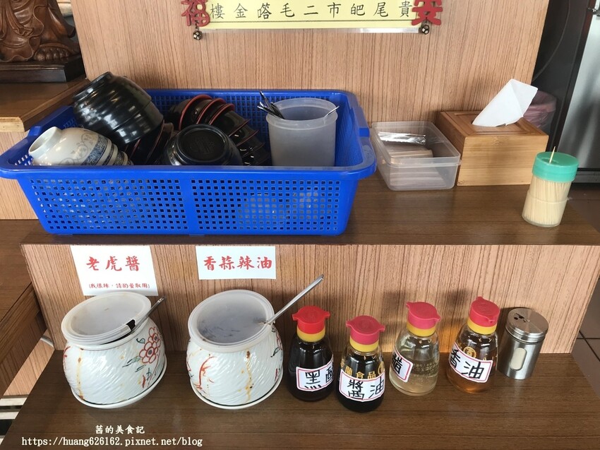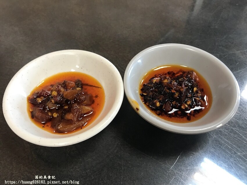 在等待餐點時陳先生去拿了辣椒醬,分別是老虎醬(左)香蒜辣油(右)