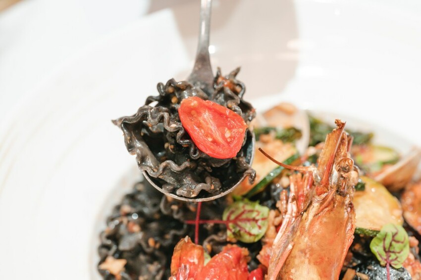 「丹比諾」的蕾絲寬帶麵在竹北就已經赫赫有名,特色在於麵體已於製作時先以墨魚汁混合,跟外面販售的墨魚麵不一樣,有香氣但不會吃得戰戰兢兢,也不會沾了滿口醬汁,可以放心地點來吃了!而且波浪線條的吃得出紮實的手工製作過程,咬勁與韌度並未因為烹調溫度跟醬汁而變得軟爛,邊嚼還不斷散發麵粉自帶的香氣!