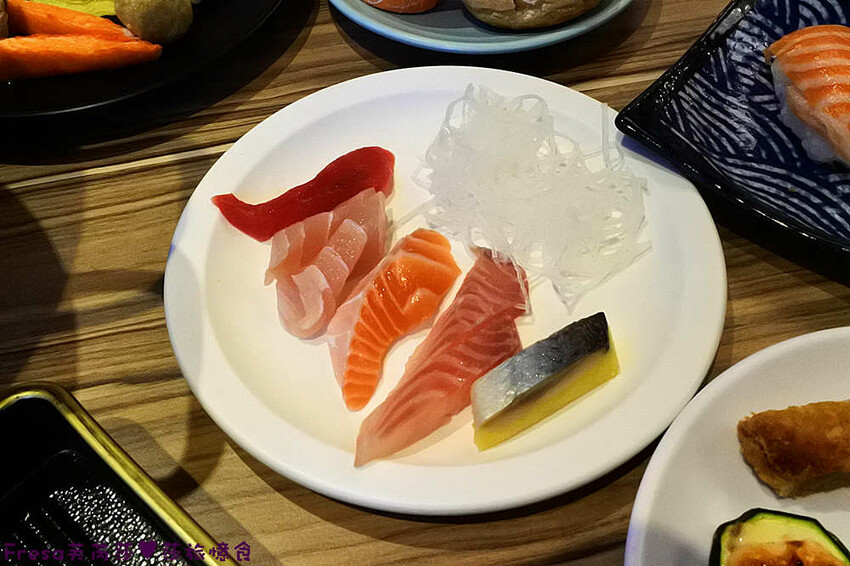 生魚片有鮭魚生魚片、鮪魚生魚片、