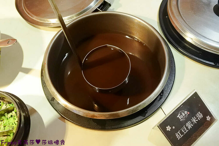 甜點有蛋糕、水果、紅豆紫米湯、紅棗雪耳湯.
