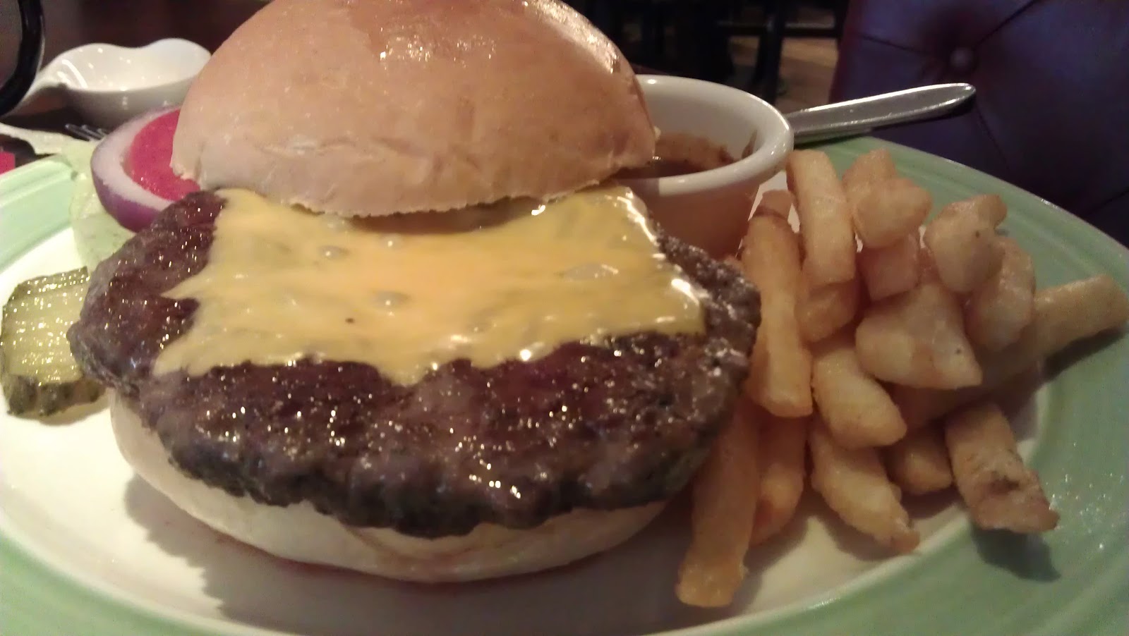 起司牛肉漢堡,牛奶麵包、薯條、肉汁沾醬