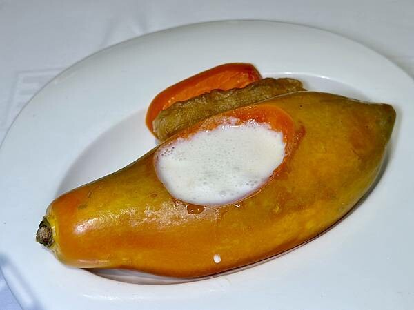 一整顆的木瓜,搭配杏仁茶燉煮,