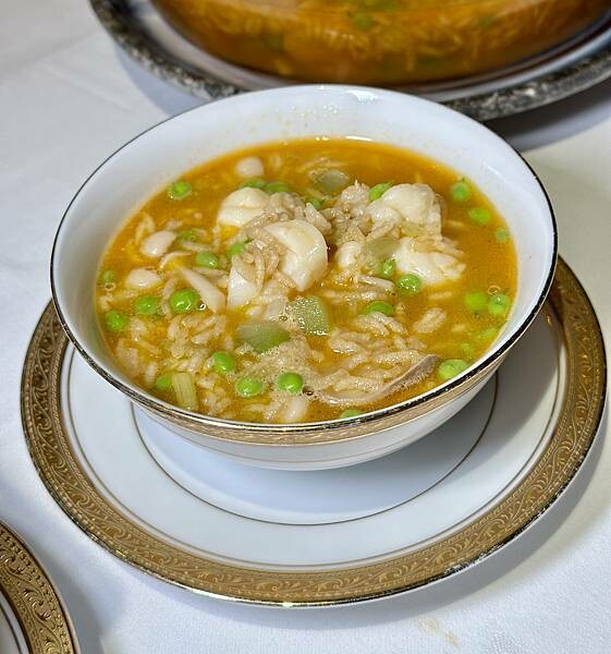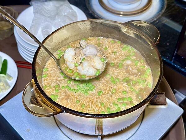 再加入龍蝦肉、干貝、青豆、香菇…等食材熬煮,