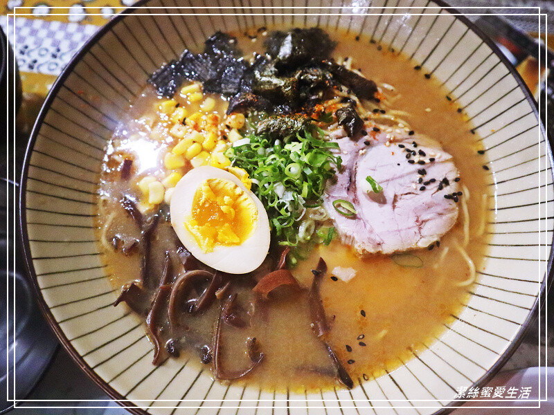 主食終於登場!配料有半顆溏心蛋/玉米粒/叉燒/木耳,必須說這豚骨湯頭和想像中的有些不同,覺得豚骨味不是那麼濃厚,我們比較不習慣這口味。
